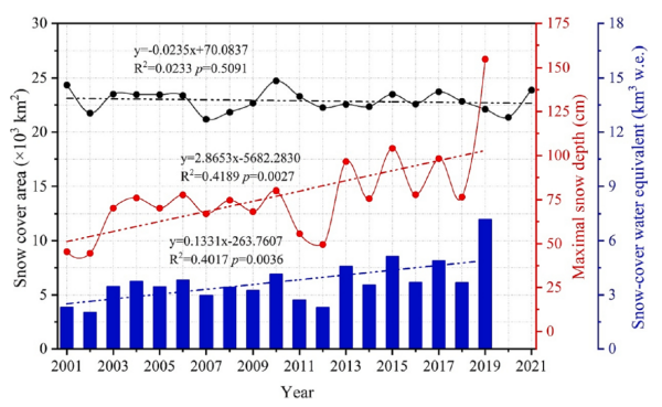 图2 2000-2021年中国境内阿尔泰山积雪面积、最大雪深和积雪水当量变化