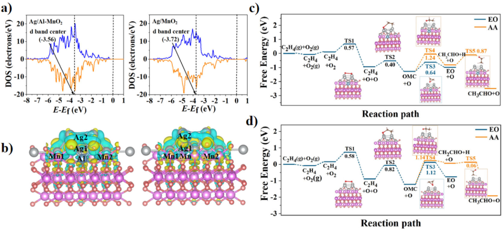 金属修饰进行催化剂结构调控促进催化活性,本研究在MnO2载体中掺杂Al元素实现了Ag物种3d电子结构的调控。通过金属载体电子相互作用调控MnO2载体上Ag的电子结构。研究结果发现Al修饰产生的强金属载体电子相互作用能够促进乙烯环氧化过程关键中间物种氧金属环(OMC)的生成,从而加速了环氧乙烷的产生。